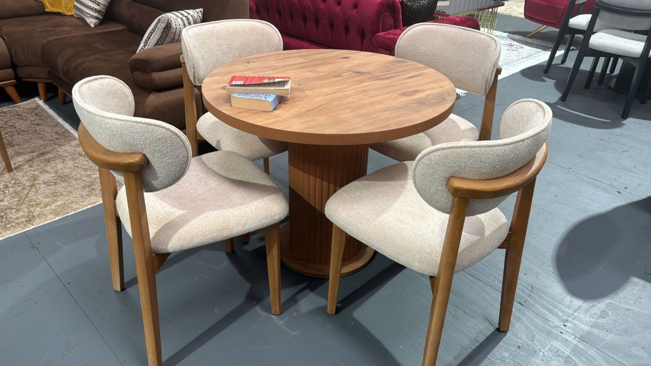This premium dining set includes a natural white wooden table (160×90 cm) with sturdy wooden legs, paired with four velvet cream chairs featuring matching wooden legs. A perfect blend of elegance, comfort, and timeless craftsmanship for your dining space.