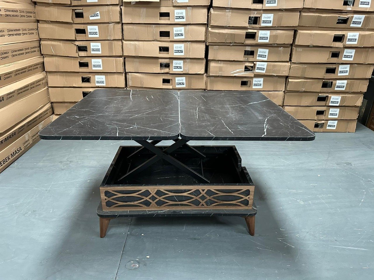Auric Arc Coffee Table blends elegant design and smart functionality with a dark marble-like top, gold-accented lift mechanism, and artistic wooden front. Designed by Mairaaki, it’s the perfect centerpiece for modern, versatile living spaces.