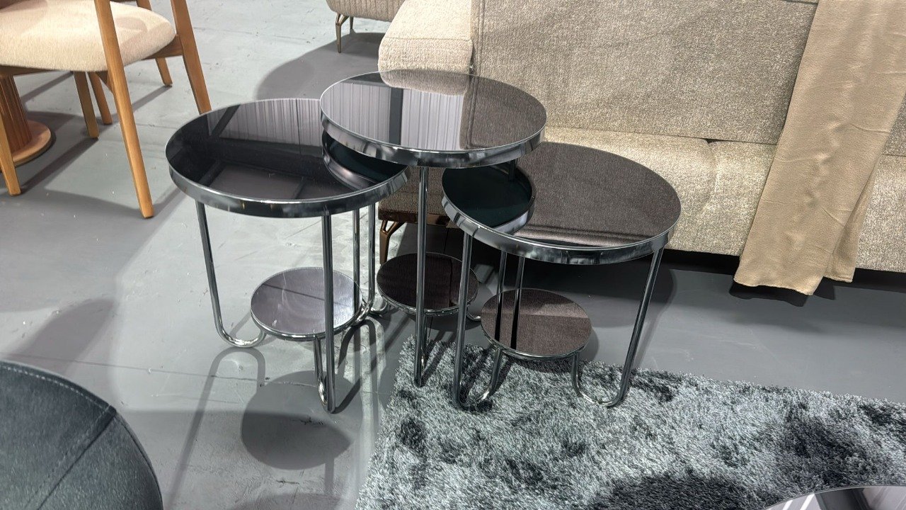 Each table in the set features a round top in slightly varying sizes and heights, creating an elegant, sculptural effect when layered. This nesting design is ideal for dynamic spaces, offering both function and flow without clutter.