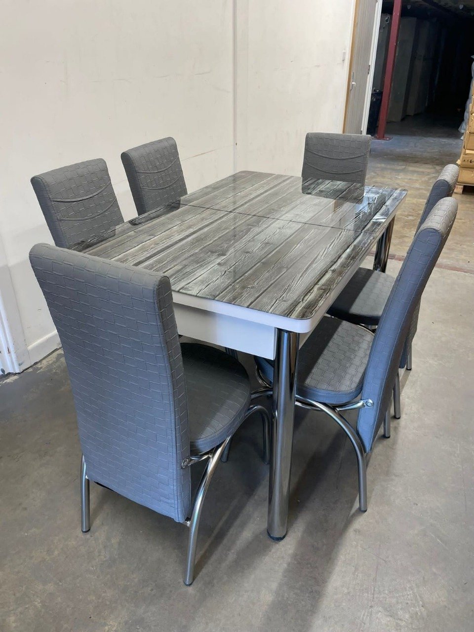 The Infinity Design Dining Set features a full glass-covered dining table with six stylish chairs, blending wood-inspired texture with modern chrome accents. Measuring 130 x 80 cm and extendable to 170 x 80 cm, it offers both elegance and functionality for any contemporary dining space.