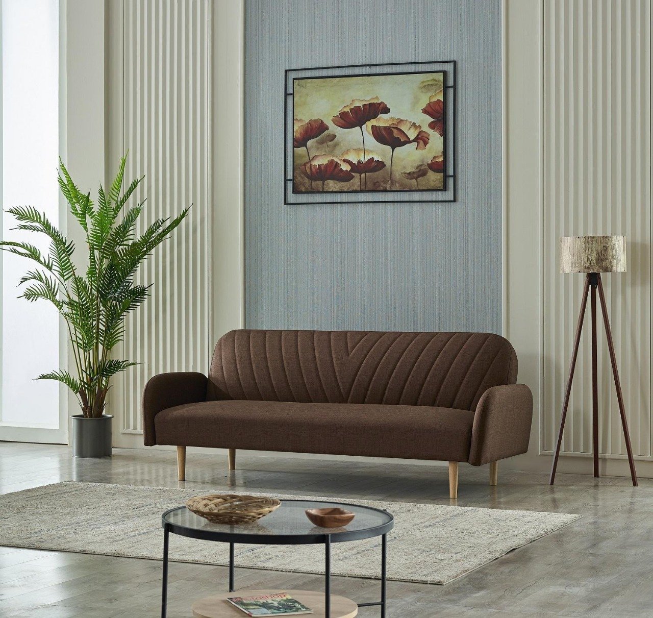 Families, couples, or anybody else wishing to add a statement piece to their home without overpowering it would love it. The space features a rich brown Solea Sofa with smooth curved armrests and wooden legs, set against a light blue textured wall adorned with a framed painting of red and beige poppies. A tall potted plant with feathery green leaves adds a touch of greenery on one side, while a wooden tripod floor lamp with an earthy-toned shade stands on the other. A light grey textured rug covers the wooden floor beneath a round black-framed glass coffee table, topped with a wicker basket and a small dish. The overall ambience is calm, stylish, and thoughtfully curated.